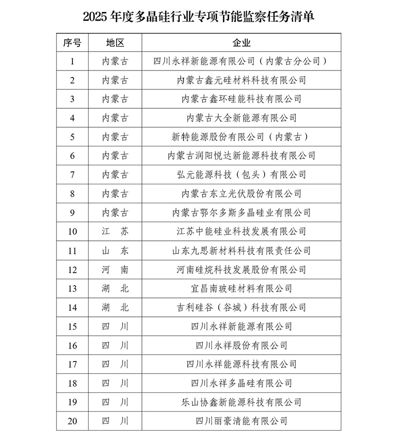 【转发】工业和信息化部办公厅关于印发2025年度多晶硅行业专项节能监察任务清单的通知