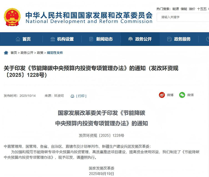 近日,国家发展和改革委员会正式印发《节能降碳中央预算内投资专项管理办法》(发改环资规〔2025〕1228号) 。该办法旨在加强和规范中央预算内投资节能降碳项目管理,切实发挥资金效益,为实现碳达峰碳中和目标提供有力支撑。