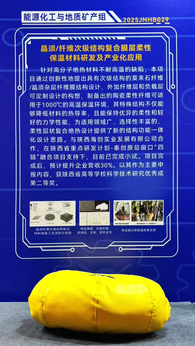 《晶须/纤维次级结构复合膜层柔性保温材料研发及产业化应用》项目是2024年陕西省秦创原“四链”融合省级重点研发计划。该项目针对高分子绝热材料不耐高温的缺陷,通过创新性地提出具有次级结构的莫来石纤维/晶须杂层纤维膜结构设计,外加纤维层和负载房可定制设计的构想,制备出的陶瓷柔性纤维可适用于1000℃的高温保温环境,其特殊结构不仅能够降低材料的热导率,且能保持优异的柔性和较好的力学性能,为适用领域广、选择性丰富的、柔性层状复合绝热设计提供了新的结构功能一体化设计思路。目前,已完成小试。