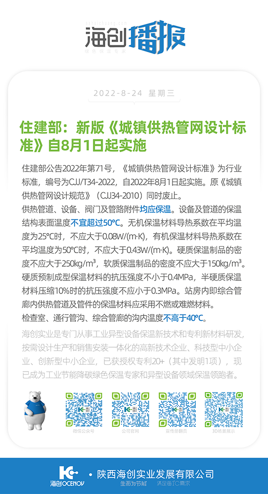 住建部公告2022年第71号,《城镇供热管网设计标准》为行业标准,编号为CU/T34-2022,自2022年8月1日起实施。原《城镇供热管网设计规范》(CJJ34-2010)同时废止。