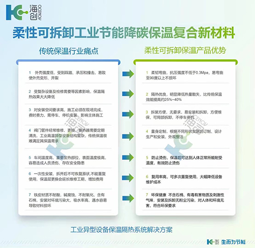 公司从未停止研发和开拓计划,以每2-3年为一个周期,加大自主科技研发资金投入强度,加快产品迭代速度,不断做到“一高一低”即性能提高、价格降低。本专利复合新材料温度适用范围为-30~1200℃、厚度30~100mm,保温后表面温度降至35~45℃,节能效率提升40%以上(按表面积1m2、未保温前160℃、保温后40℃计算,每年可节约1t标煤和CO?减排0.104t);具有柔韧弯曲、量身订制、隔热优良、防止烫伤、拆装方便、重复利用、防火憎水抗菌、耐化学性、环保健康等显著优点。
