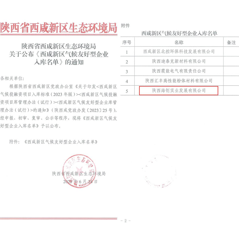 2025年6月24日,陕西省西咸新区生态环境局正式授予陕西海创实业发展有限公司“西咸新区气候友好型企业”称号。这标志着陕西海创实业在践行绿色发展理念、积极应对气候变化、推动工业领域节能减排方面所做出的突出贡献,获得了政府主管部门的高度认可。
