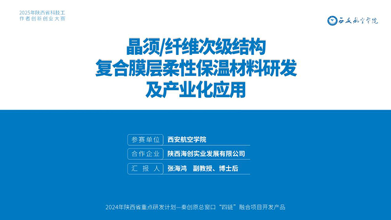 由西安航空学院与陕西海创实业发展有限公司联合申报的《晶须/纤维次级结构复合膜层柔性保温材料研发及产业化应用》项目,经过多轮激烈角逐,最终荣获大赛决赛能源化工与地质矿产领域二等奖。